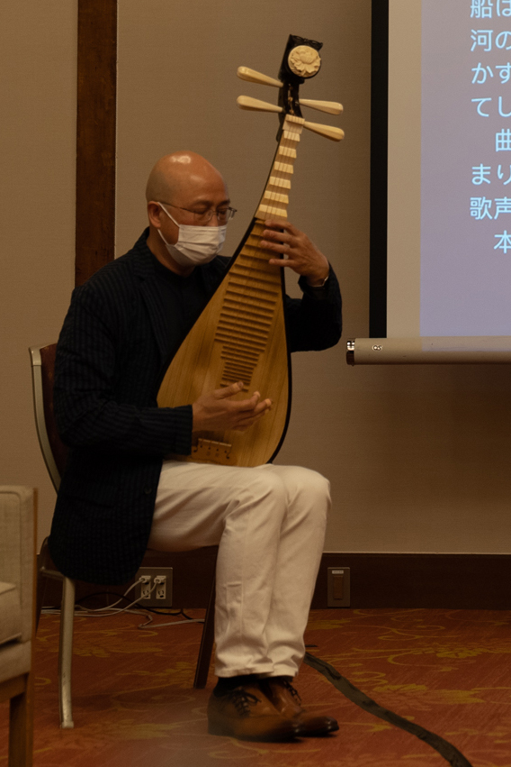 叶会长表示,自己是琵琶演奏家,琵琶的传播、演变历史中也蕴含着中日交流的故事。琵琶由中国传来日本,最初是有五根弦,后演变为四弦,当下仅存的五弦古琵琶便保存在奈良正仓院,成为中日文化交流的历史见证。叶会长还回顾了自己通过琵琶演奏参与两国文化交流的故事,表示将继续用音乐深化两国人民的理解与友情。叶会长还在现场用琵琶演奏了中国唐初诗人张若虚所作名曲《春江花月夜》,令大家赞叹不已。